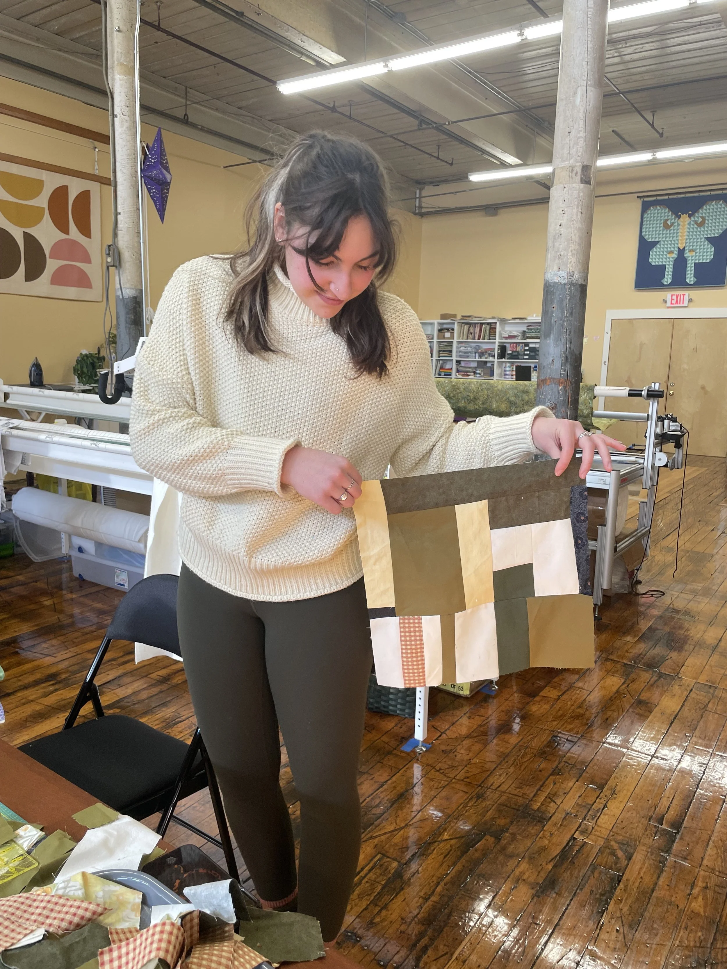 This workshop will consist of timed rounds: sew a quilt block, pass it to the next quilter. Each round the quilter must piece a quilt block connecting to the block before it. At the end of 6 rounds each participant will have a row of 6 blocks to take home: a collaborative catalyst for your next quilt!